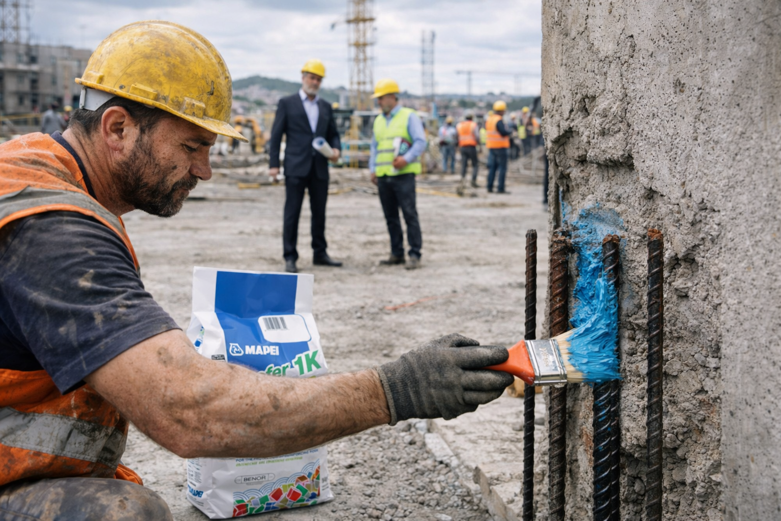 Lo strato protettivo di Mapefer 1K Zero inibisce la formazione di ruggine sulle armature in ferro, migliorando la durabilità delle strutture armate prima dell’applicazione delle malte di riparazione.